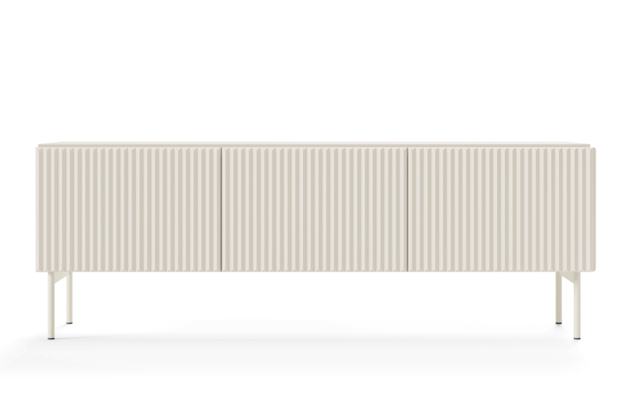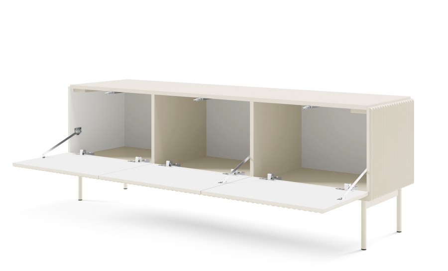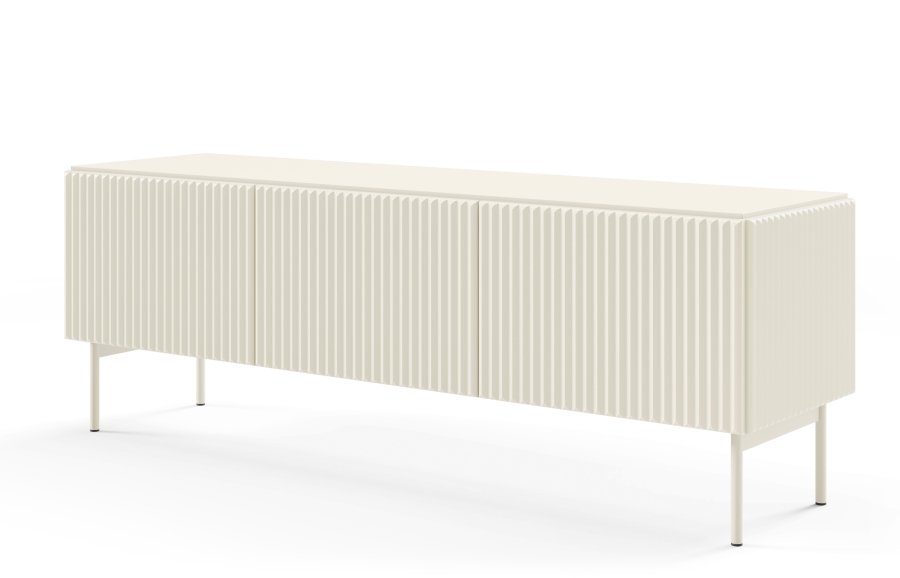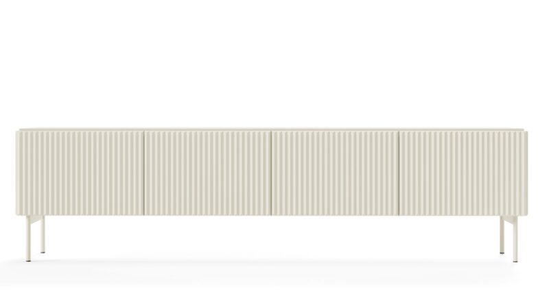 Τα τρισδιάστατα μοτίβα με τη μορφή αυλακώσεων και φρεζαρισμάτων αποτελούν μια νέα τάση στη εσωτερική διακόσμηση, καθιστώντας τις συνθέσεις πιο αισθησιακές – διεγείρουν όχι μόνο την αίσθηση της όρασης, αλλά και της αφής. Το σετ Muti με αυλακωτές προσόψεις ταιριάζει απόλυτα σε αυτή την τάση. Η σειρά επίπλων Muti συνδυάζει λειτουργικότητα με μοντέρνο σχεδιασμό. Είναι κατασκευασμένα από ανθεκτική μελαμίνη σε συνδυασμό με όψεις από MDF που αποτελούν εγγύηση για τη μακροχρόνια χρήση τους. Τα έπιπλα έχουν προσόψεις χωρίς λαβές, γεγονός που τους προσδίδει μια κομψή, μινιμαλιστική εμφάνιση. Τα έπιπλα στηρίζονται σε λεπτά μεταλλικά πόδια ύψους 18cm, προσθέτοντας ελαφρότητα στο σύνολο.