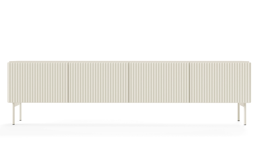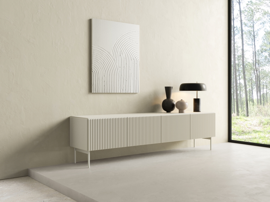 Τα τρισδιάστατα μοτίβα με τη μορφή αυλακώσεων και φρεζαρισμάτων αποτελούν μια νέα τάση στη εσωτερική διακόσμηση, καθιστώντας τις συνθέσεις πιο αισθησιακές – διεγείρουν όχι μόνο την αίσθηση της όρασης, αλλά και της αφής. Το σετ Muti με αυλακωτές προσόψεις ταιριάζει απόλυτα σε αυτή την τάση. Η σειρά επίπλων Muti συνδυάζει λειτουργικότητα με μοντέρνο σχεδιασμό. Είναι κατασκευασμένα από ανθεκτική μελαμίνη σε συνδυασμό με όψεις από MDF που αποτελούν εγγύηση για τη μακροχρόνια χρήση τους. Τα έπιπλα έχουν προσόψεις χωρίς λαβές, γεγονός που τους προσδίδει μια κομψή, μινιμαλιστική εμφάνιση. Τα έπιπλα στηρίζονται σε λεπτά μεταλλικά πόδια ύψους 18cm, προσθέτοντας ελαφρότητα στο σύνολο.