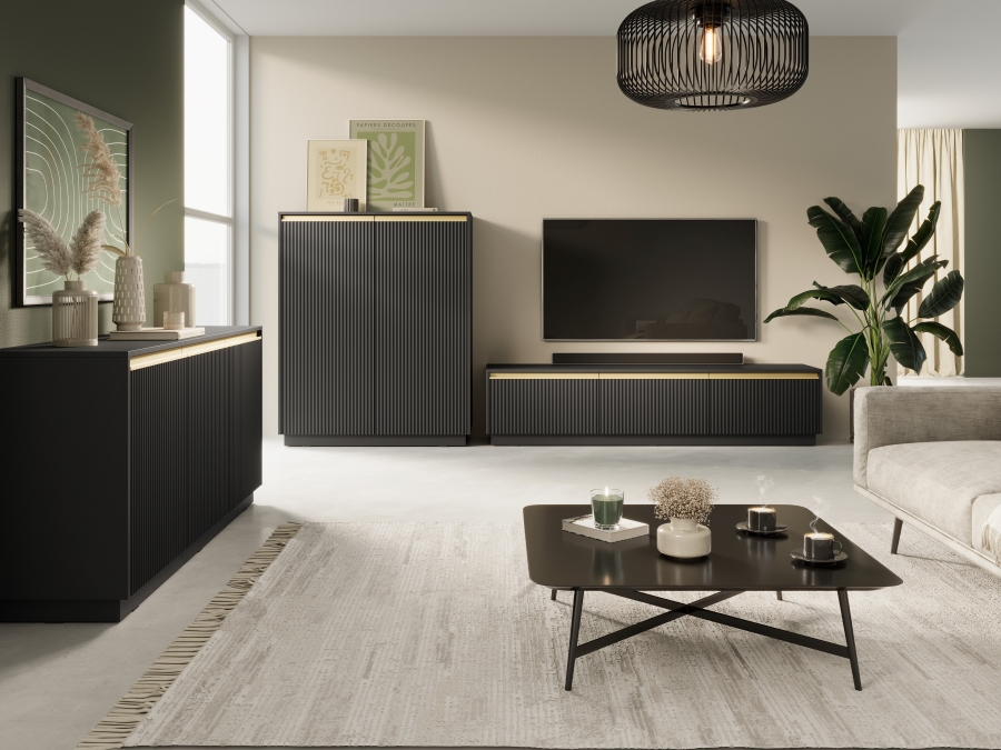 Μοντέρνος σχεδιασμός : Οι φρεζαρισμένες προσόψεις από MDF 18 mm και οι χρυσές αλουμινένιες λαβές προσδίδουν στο έπιπλο έναν μοναδικό χαρακτήρα που συνδυάζει τέλεια την κομψότητα με τη λειτουργικότητα.