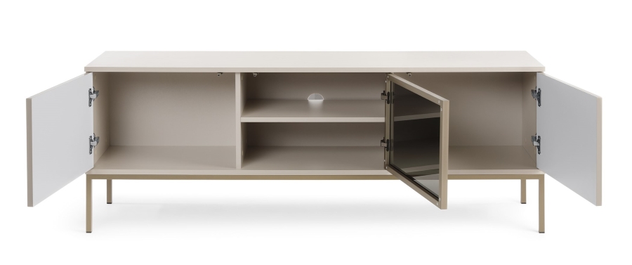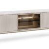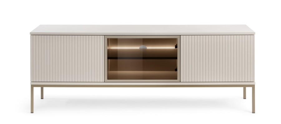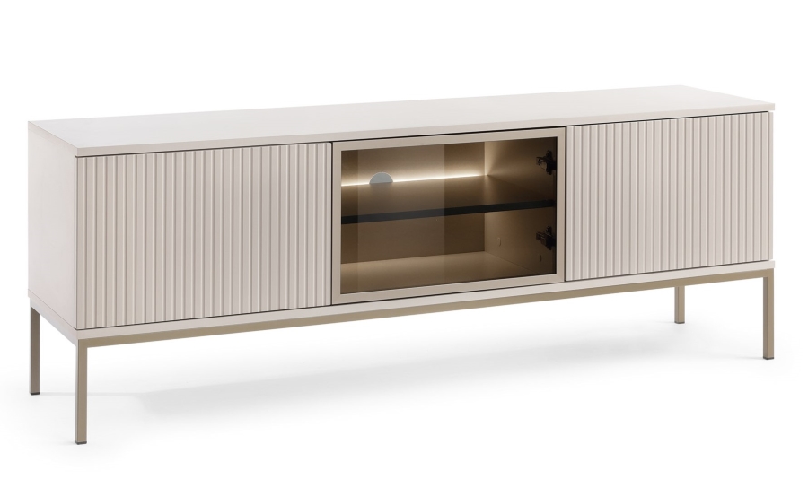 Το έπιπλο τηλεόρασης Sento με μοναδικό σχεδιασμό, δημιουργημένο με προσοχή στην κάθε λεπτομέρεια, είναι η τέλεια λύση για το σαλόνι σας. Το αναμφισβήτητο πλεονέκτημα του ντουλαπιού τηλεόρασης είναι οι μεγάλοι αποθηκευτικοί χώροι και τα πρόσθετα ντουλάπια που θα βοηθήσουν στην καλή οργάνωση στο σαλόνι και θα εξοικονομήσουν χώρο. Μοντέρνος, μινιμαλιστικός σχεδιασμός σε συνδυασμό με το λευκό χρώμα άμμου το κάνουν να φαίνεται εξαιρετικά κομψό και μοντέρνο. Είναι εξοπλισμένο με φωτισμό LED, που του προσδίδει μοναδική γοητεία και δημιουργεί μια ευχάριστη ατμόσφαιρα στο δωμάτιο . Η ατσάλινη κατασκευή των ποδιών εξασφαλίζει σταθερότητα και ανθεκτικότητα, ενώ προσθέτει μια βιομηχανική γοητεία. Η μοντέρνα και κομψή εμφάνιση των επίπλων συμπληρώνεται από τη γυάλινη πόρτα με το μεταλλικό πλαίσιο.