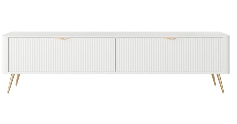 Το έπιπλο τηλεόρασης Royal είναι η ιδανική λύση για άτομα που εκτιμούν τόσο το μοντέρνο σχεδιασμό όσο και τη λειτουργικότητα. Η στιβαρή κατασκευή του από υλικά υψηλότερης ποιότητας, εγγυάται μακροζωία και αντοχή στην καθημερινή χρήση. Θα λειτουργήσει υπέροχα σε κάθε δωμάτιο, όπου δεν θα είναι μόνο ένα διακοσμητικό στοιχείο, αλλά και ένας πρακτικός χώρος αποθήκευσης. Οι προσόψεις από κατεργασμένο MDF του προσδίδουν έναν μοναδικό χαρακτήρα, ενώ οι λαβές από αλουμίνιο και χρυσό προσθέτουν μια διακριτική, κομψή πινελιά που σίγουρα θα τραβήξει την προσοχή. Το ματ λευκό/χρυσό χρωματικό συνδυασμό ταιριάζει αρμονικά σε μοντέρνες, μινιμαλιστικές διατάξεις, ταιριάζοντας τέλεια με διάφορα στυλ εσωτερικής διακόσμησης.