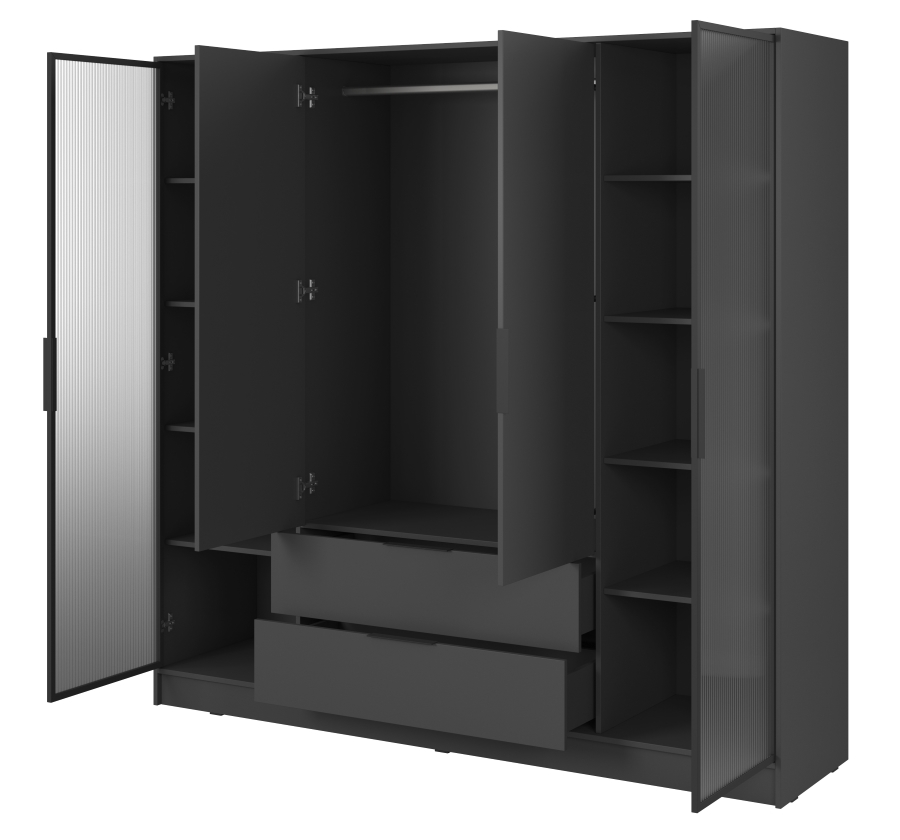 Η τετράφυλλη ντουλάπα Kelly είναι μια μοναδική επιλογή για άτομα που αναζητούν μοντέρνες, κομψές λύσεις για την κρεβατοκάμαρά τους.Ο συνδυασμός κλειστών και ημιδιάφανων χώρων δίνει μια διαφορετική αίσθηση στο χώρο. Χάρη στο ευρύχωρο εσωτερικό της τα ρυθμιζόμενα ράφια και τα συρτάρια, η ντουλάπα παρέχει πλήρη ελευθερία οργάνωσης. Ιδανική τόσο για το υπνοδωμάτιο όσο και για το γκαρνταρόμπα, η ντουλάπα Kelly θα σας βοηθήσει να αποθηκεύσετε εύκολα ρούχα, αξεσουάρ και άλλα απαραίτητα αντικείμενα.. Διαθέτει 11 ράφια και 2 συρτάρια καθιστώντας την ιδανική για αποθήκευση αντικειμένων. Η ντουλάπα διατίθεται επίσης σε άλλα χρώματα και σε έκδοση με καθρέφτη.