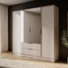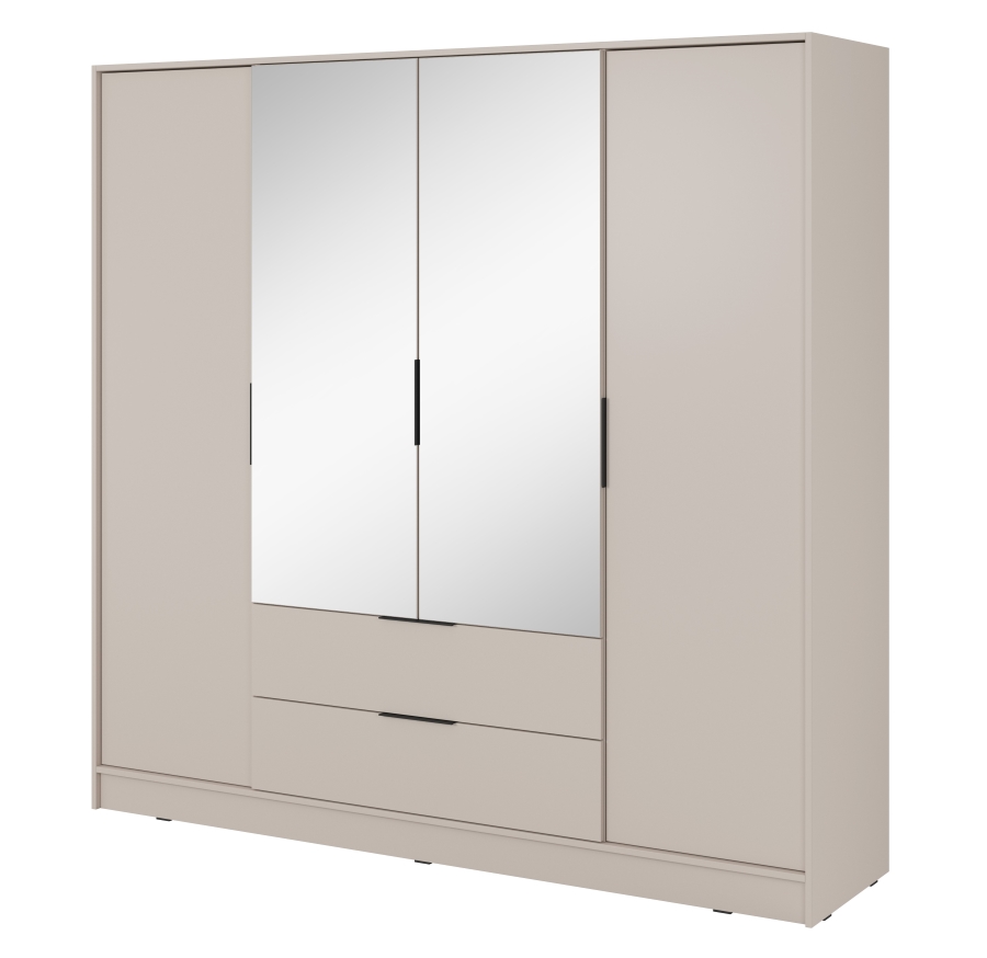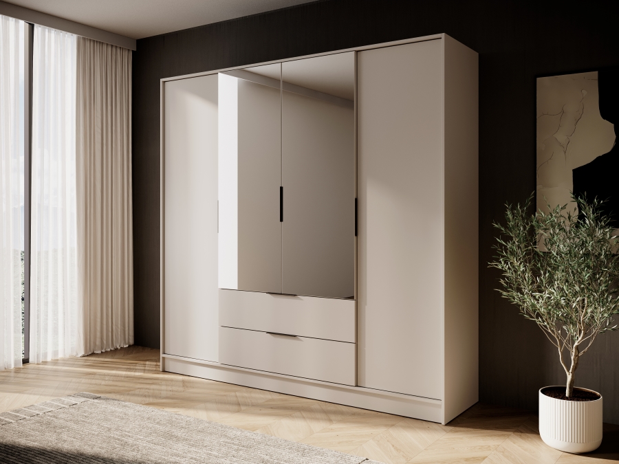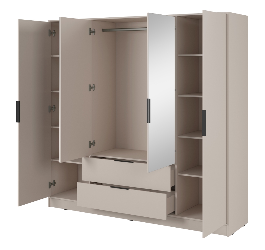 Η τετράφυλλη ντουλάπα Kelly είναι μια μοναδική επιλογή για άτομα που αναζητούν μοντέρνες, κομψές λύσεις για την κρεβατοκάμαρά τους. Χάρη στο ευρύχωρο εσωτερικό της τα ρυθμιζόμενα ράφια και τα συρτάρια, η ντουλάπα παρέχει πλήρη ελευθερία οργάνωσης. Ιδανική τόσο για το υπνοδωμάτιο όσο και για το γκαρνταρόμπα, η ντουλάπα Kelly θα σας βοηθήσει να αποθηκεύσετε εύκολα ρούχα, αξεσουάρ και άλλα απαραίτητα αντικείμενα.. Διαθέτει 11 ράφια και 2 συρτάρια καθιστώντας την ιδανική για αποθήκευση αντικειμένων. Η ντουλάπα διατίθεται επίσης σε άλλα χρώματα και σε έκδοση χωρίς καθρέφτη.