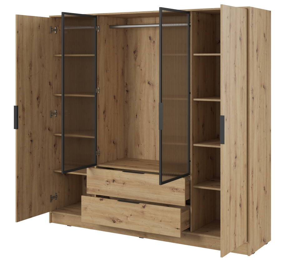 Η τετράφυλλη ντουλάπα Kelly είναι μια μοναδική επιλογή για άτομα που αναζητούν μοντέρνες, κομψές λύσεις για την κρεβατοκάμαρά τους.Ο συνδυασμός κλειστών και ημιδιάφανων χώρων δίνει μια διαφορετική αίσθηση στο χώρο. Χάρη στο ευρύχωρο εσωτερικό της τα ρυθμιζόμενα ράφια και τα συρτάρια, η ντουλάπα παρέχει πλήρη ελευθερία οργάνωσης. Ιδανική τόσο για το υπνοδωμάτιο όσο και για το γκαρνταρόμπα, η ντουλάπα Kelly θα σας βοηθήσει να αποθηκεύσετε εύκολα ρούχα, αξεσουάρ και άλλα απαραίτητα αντικείμενα.. Διαθέτει 11 ράφια και 2 συρτάρια καθιστώντας την ιδανική για αποθήκευση αντικειμένων. Η ντουλάπα διατίθεται επίσης σε άλλα χρώματα και σε έκδοση με καθρέφτη.