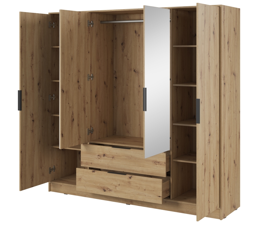 Η Η τετράφυλλη ντουλάπα Kelly είναι μια μοναδική επιλογή για άτομα που αναζητούν μοντέρνες, κομψές λύσεις για την κρεβατοκάμαρά τους. Χάρη στο ευρύχωρο εσωτερικό της τα ρυθμιζόμενα ράφια και τα συρτάρια, η ντουλάπα παρέχει πλήρη ελευθερία οργάνωσης. Ιδανική τόσο για το υπνοδωμάτιο όσο και για το γκαρνταρόμπα, η ντουλάπα Kelly θα σας βοηθήσει να αποθηκεύσετε εύκολα ρούχα, αξεσουάρ και άλλα απαραίτητα αντικείμενα.. Διαθέτει 11 ράφια και 2 συρτάρια καθιστώντας την ιδανική για αποθήκευση αντικειμένων. Η ντουλάπα διατίθεται επίσης σε άλλα χρώματα και σε έκδοση χωρίς καθρέφτη.