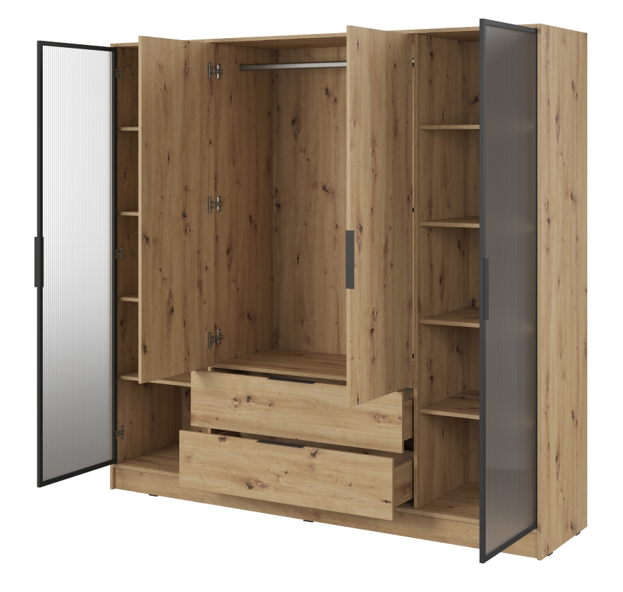 Η τετράφυλλη ντουλάπα Kelly είναι μια μοναδική επιλογή για άτομα που αναζητούν μοντέρνες, κομψές λύσεις για την κρεβατοκάμαρά τους.Ο συνδυασμός κλειστών και ημιδιάφανων χώρων δίνει μια διαφορετική αίσθηση στο χώρο. Χάρη στο ευρύχωρο εσωτερικό της τα ρυθμιζόμενα ράφια και τα συρτάρια, η ντουλάπα παρέχει πλήρη ελευθερία οργάνωσης. Ιδανική τόσο για το υπνοδωμάτιο όσο και για το γκαρνταρόμπα, η ντουλάπα Kelly θα σας βοηθήσει να αποθηκεύσετε εύκολα ρούχα, αξεσουάρ και άλλα απαραίτητα αντικείμενα.. Διαθέτει 11 ράφια και 2 συρτάρια καθιστώντας την ιδανική για αποθήκευση αντικειμένων. Η ντουλάπα διατίθεται επίσης σε άλλα χρώματα και σε έκδοση με καθρέφτη.