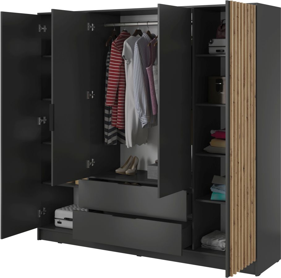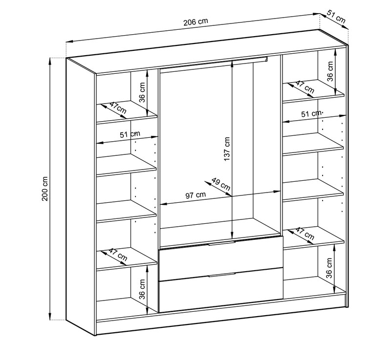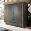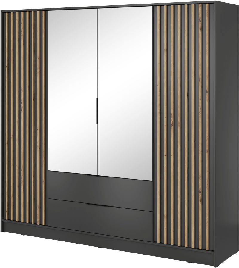 Η ντουλάπα Nelly είναι μια πρακτική επιλογή ντουλάπας. Συνδυάζει λειτουργικότητα και μοντέρνο σχεδιασμό. Διαθέτει 2 βαθιά συρτάρια 4 αποσπώμενα εσωτερικά ράφια στα πλαϊνά ντουλάπια και κάθετες λωρίδες από MDF 18 mm στις πόρτες. Η ντουλάπα διατίθεται επίσης σε άλλα μεγέθη και χρώματα και σε έκδοση με ή χωρίς καθρέφτη.